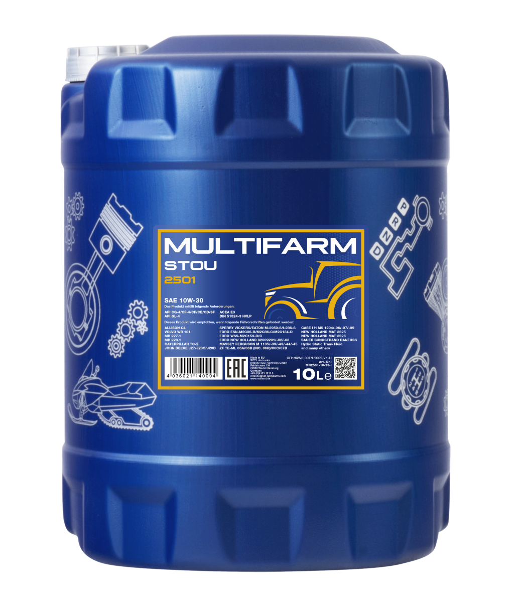 The use of agricultural equipment is characterised by a high dependency of the operation mode and weather conditions, the possibility of a round-the-clock operation, the remoteness from service centres, a wide range of additional attachments and, most commonly, a poor technical competence of the personnel. The use of MANNOL Multifarm STOU 10W-30 eliminates the risk of the equipment issues related to the oil use confusion, when the markings on the containers become illegible due to weather conditions when stored outdoors. The oil use facilitates accounting and storage. In the field, it is enough to take one canister and resolve the issue of adding oil into any piece of equipment in any situation.